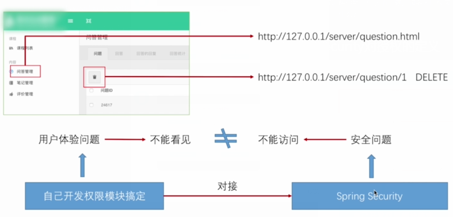 上图意思就是说,页面能看到的只是体验和ui交互问题;而对应后台某一个url的是否能被访问被认为是权限