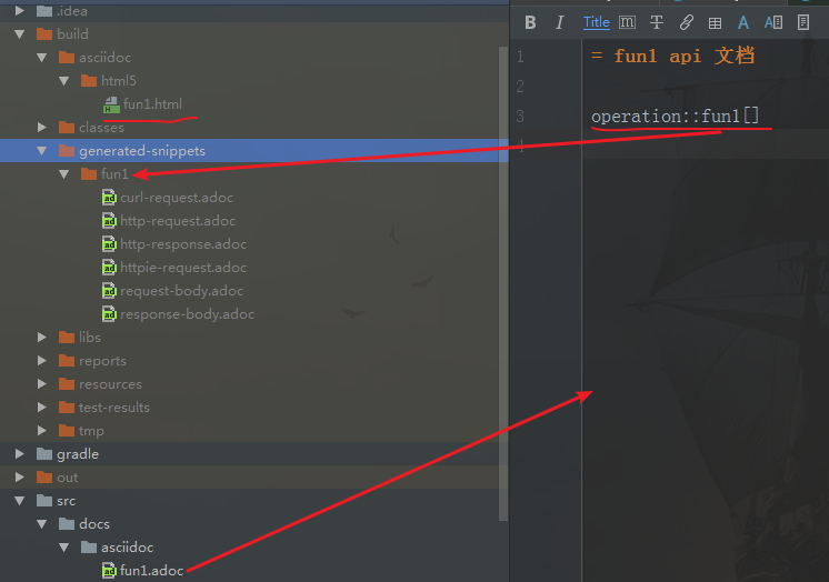 这里生成的代码片断,也就是fun1目录下的.adoc文件,打开看的话都是很简单的 asciidoctor 语法;可以看到之前说的 spring提供的api就是为了抓取到相应的数据,然后按照 asciidoctor 语法生成文件;