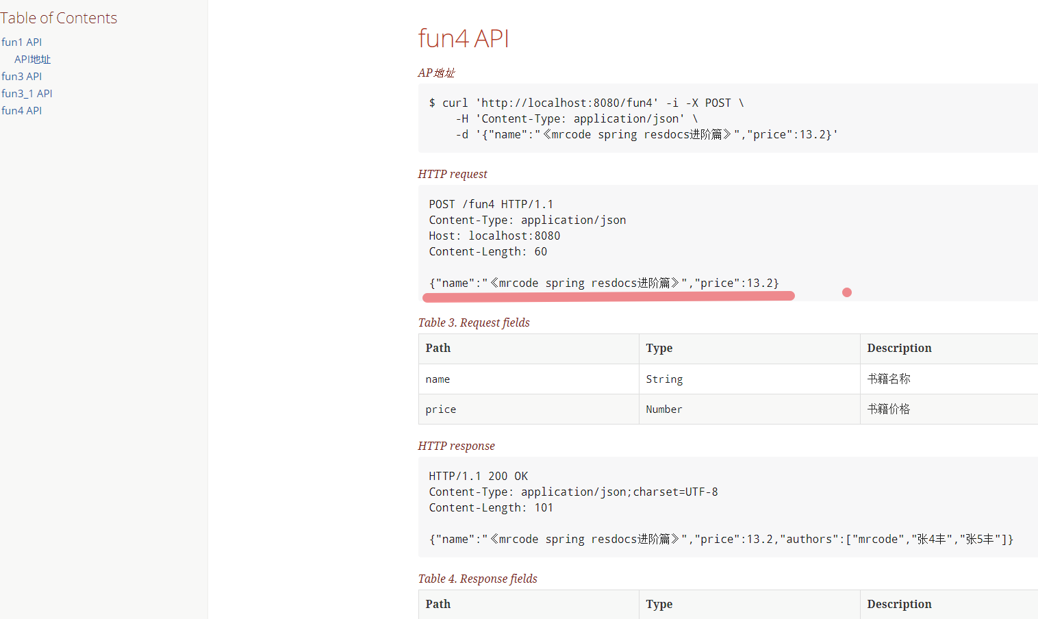 src/docs/asciidoc/fun4.adoc 中和 之前的 fun3_1.adoc 的类似,变化的是一个引用文件,request-fields.adoc 因为这里请求是用的json串了,不再是requestParameters了;